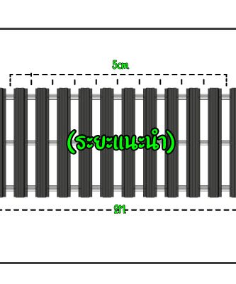 เว้นช่องของรั้วระแนงเมทัลชีทระยะห่าง 5cm. 1 แพ็คมี 6 ชิ้น จะได้ระยะพื้นที่ประมาณ 1M. ในภาพตัวอย่างใช้ 2 แพ็ค ได้ระยะพื้นที่ 2M. หรือ ลูกค้าสามารถปรับแต่งระยะห่างตามความเหมาะสมเพื่อความสวยงาม
